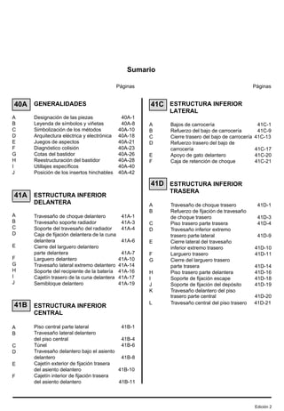 Este documento proporciona información sobre la designación de las piezas de la estructura de un vehículo. Explica cómo identificar las diferentes partes de la estructura inferior, superior y lateral del vehículo mediante códigos de capítulos y letras asignadas a cada pieza. También incluye ilustraciones de las principales piezas de la estructura con sus respectivas designaciones.