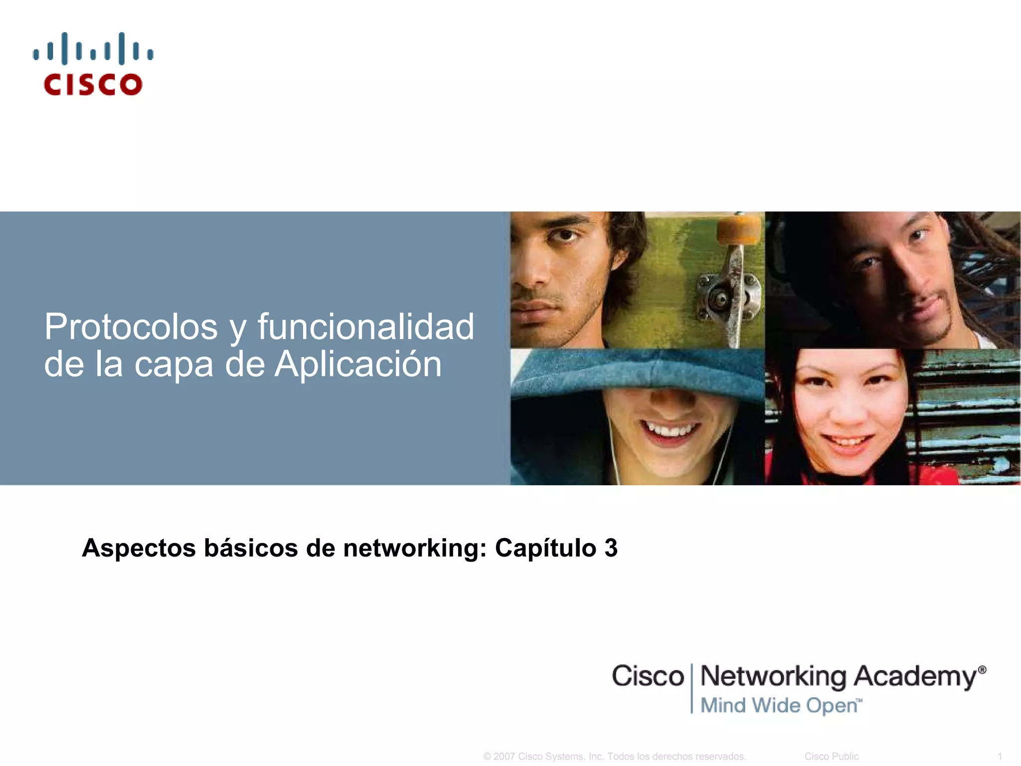 El documento describe los conceptos básicos de la capa de aplicación en redes de datos. Explica que la capa de aplicación convierte la comunicación entre personas en datos que pueden transmitirse a través de la red mediante protocolos y servicios. Menciona protocolos comunes como HTTP, DNS, SMTP, POP y protocolos para el intercambio de archivos y comunicaciones P2P.