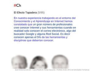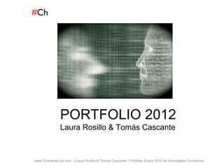 Este documento presenta el portafolio de actividades formativas de una empresa llamada Charisma-Ltd para el año 2012. Incluye una descripción de los servicios de formación que ofrecen en temas relacionados con las herramientas digitales y las redes sociales, así como los objetivos, contenidos y metodologías de nueve unidades formativas generales y ocho sectoriales.