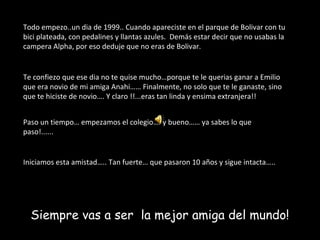 Este documento celebra una amistad de 10 años entre dos amigas que se conocieron en 1999. Detalla varios eventos y recuerdos compartidos a lo largo de su amistad, incluyendo vivir experiencias en la casa abandonada, apodos como "El Rana", mudanzas, lesiones y viajes. A pesar de los cambios a lo largo de los años, el documento enfatiza que la amistad entre ellas permanece fuerte e intacta.