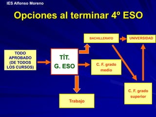 El documento proporciona información sobre las opciones disponibles después de completar 4o de ESO, incluyendo bachillerato, formación profesional de grado medio y superior, educación para adultos, y enseñanzas de régimen especial. Describe las diferentes modalidades de bachillerato y las asignaturas comunes y de modalidad, así como las características de 1o de bachillerato.