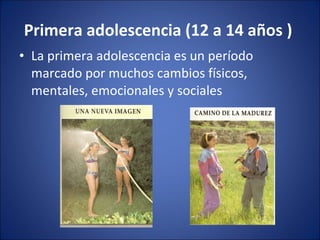 La primera adolescencia (de 12 a 14 años) es un período de grandes cambios físicos, emocionales y sociales. Los adolescentes se preocupan más por su apariencia física y ropa, pasan por altibajos de confianza, y se interesan más por sus pares. También desarrollan habilidades de razonamiento más complejas y capacidad de expresar sentimientos. Los padres deben adaptarse a la edad y personalidad de sus hijos, establecer normas claras, y buscar ayuda si el comportamiento se vuelve difícil.