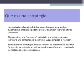 El documento resume diferentes conceptos relacionados con la estrategia competitiva. Define la estrategia como la distribución de recursos para lograr objetivos frente a desafíos. Explica que una ventaja competitiva debe ser distintiva, superior y difícil de copiar para los competidores. También presenta siete estrategias de marketing exitosas para el siglo XXI como enfocarse en nichos de mercado, ofrecer una experiencia única al cliente e innovar constantemente.