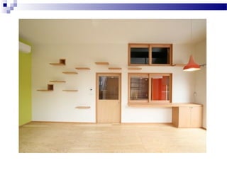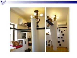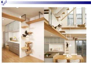 Este documento ofrece consejos para mejorar el bienestar de los gatos en el hogar, incluyendo proporcionarles espacios elevados, áreas para aislarse, varias fuentes de agua y comida, múltiples areneros, juguetes y superficies para rascar, además de decorar el hogar de forma atractiva y estimulante para los gatos. Un ambiente felino ideal requiere considerar las necesidades conductuales, sociales y físicas de los gatos.
