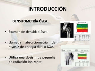 Este documento describe la densitometría ósea o DXA, un examen de imagenología que utiliza rayos X de baja dosis para medir la densidad mineral ósea y diagnosticar osteoporosis. La DXA es el método estándar para medir la densidad ósea, es un procedimiento sencillo, rápido y no invasivo que requiere poca preparación. Mide la densidad ósea en la columna y cadera usando un dispositivo central o en las extremidades usando un dispositivo portátil.