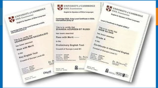 Este documento proporciona información sobre los exámenes internacionales de Cambridge que se ofrecerán en la Universidad Politécnica Salesiana. Detalla los costos de los exámenes KET, PET y FCE, el proceso de inscripción, la preparación gratuita y las fechas de evaluación en junio. Además, explica que los estudiantes de UPS que rindan estos exámenes estarán exentos de rendir los exámenes finales del siguiente nivel de inglés en la universidad.