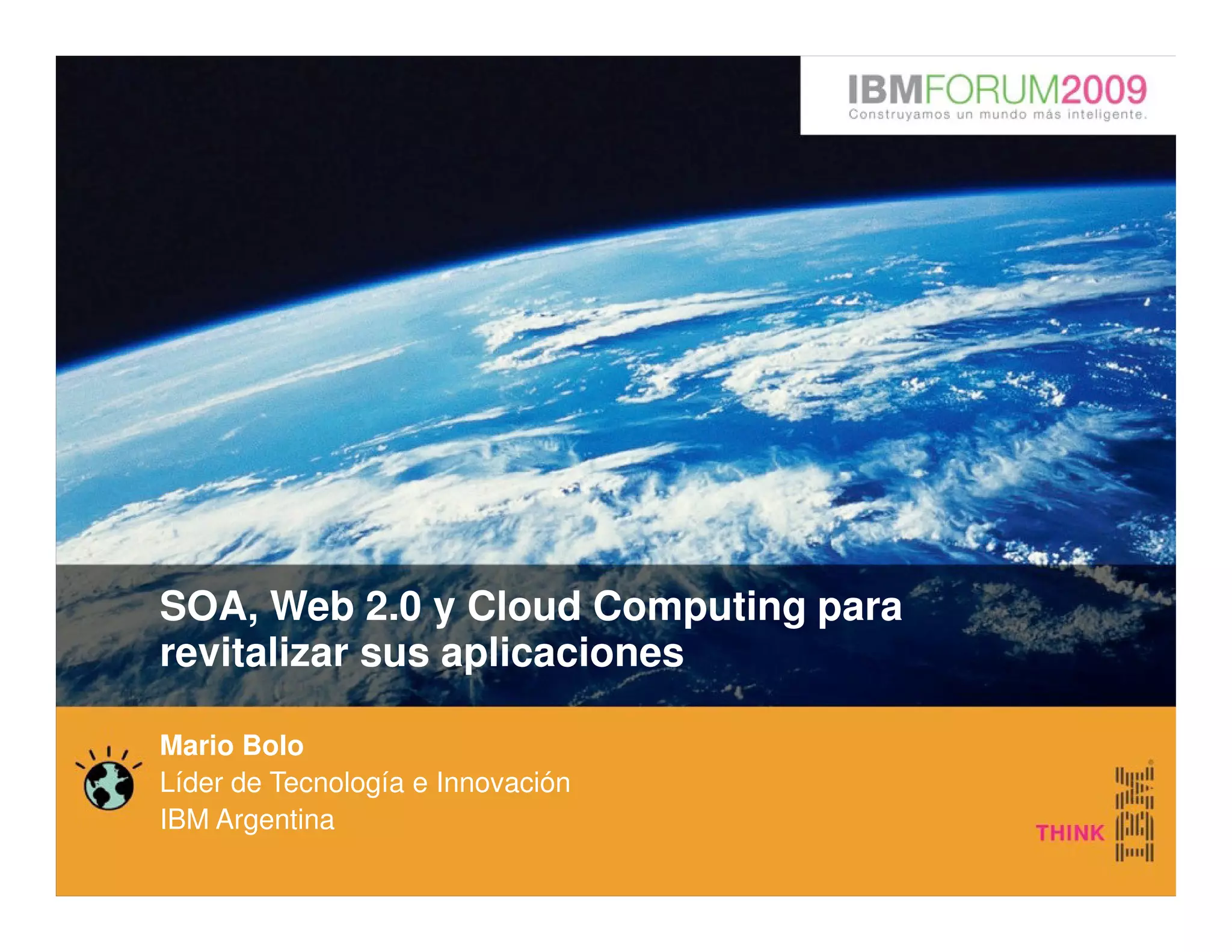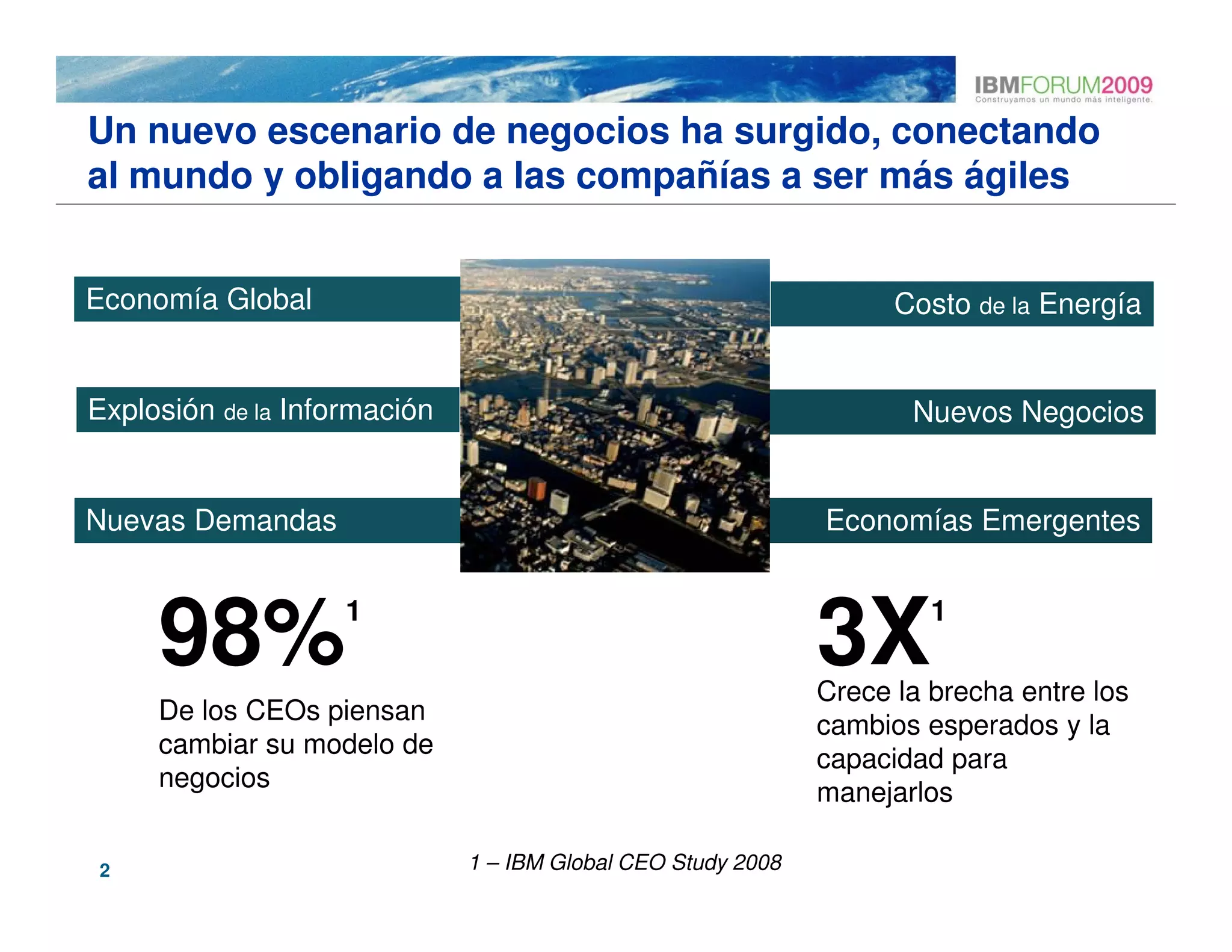 (1) Un nuevo escenario de negocios ha surgido que requiere que las compañías sean más ágiles. (2) Las aplicaciones tradicionales no proveen la agilidad requerida. (3) Hay tres innovaciones que ayudan a las aplicaciones a brindar más agilidad: Arquitectura Orientada a Servicios (SOA), Web 2.0 y Cloud Computing.