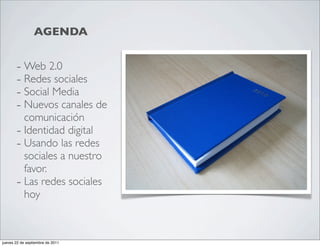 El documento presenta un taller sobre redes sociales y social media, destacando la evolución de estos conceptos y su importancia en la comunicación actual. Se discuten las características de las redes sociales, su impacto en la identidad digital y su uso en entornos profesionales y corporativos. También se mencionan estadísticas y la relevancia de plataformas como Facebook y Twitter en la interacción social.