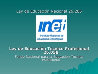 El documento describe los planes de estudio de una escuela técnica profesional en Argentina. Presenta las carreras de Técnico Mecánico, Maestro Mayor de Obras, Técnico Informático, Técnico en Electricidad, Técnico Electromecánico y Técnico Agropecuario, con una breve descripción de cada una. También menciona las leyes nacionales de educación técnica y las líneas de acción del Fondo Nacional para la Educación Técnico Profesional.