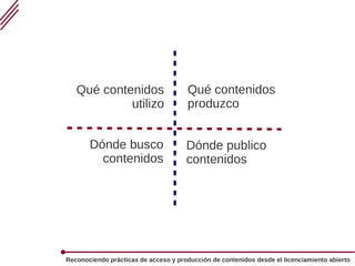Este documento explica las prácticas de acceso y producción de contenidos desde el licenciamiento abierto. Explica los derechos de autor y cómo la cultura libre permite usar y modificar contenidos bajo licencias como Creative Commons. También proporciona consejos para buscar contenidos con licencias abiertas, producir nuevos contenidos usando software libre, y publicarlos bajo una licencia Creative Commons.