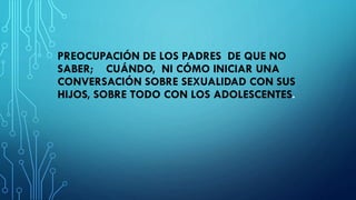 Los padres expresan preocupación por no saber cómo abordar la educación sexual de sus hijos adolescentes, especialmente ante los riesgos actuales como la pornografía y el inicio temprano de la vida sexual. La educación sexual debe ser un esfuerzo conjunto entre familia, amigos y escuelas, enfatizando la importancia de una guía adecuada en el desarrollo psicosexual. La falta de orientación puede llevar a problemas graves como embarazos no deseados y enfermedades de transmisión sexual.