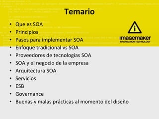 Este documento presenta una introducción a la arquitectura orientada a servicios (SOA). Explica que SOA organiza las funciones de las aplicaciones empresariales en servicios interoperables basados en estándares que pueden combinarse rápidamente para satisfacer las necesidades del negocio. También describe los principios de SOA, los pasos para implementarla, y conceptos clave como servicios, ESB y gobernanza.