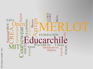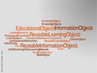 El documento aborda la conceptualización y estructura de objetos de aprendizaje, definiéndolos como recursos didácticos digitales reutilizables compuestos por contenidos, actividades y metadatos que facilitan su identificación y recuperación. Se enfatiza la importancia de la granularidad, contextualización y el uso de estándares de metadatos para garantizar la reutilización efectiva de estos recursos en distintos entornos educativos. Además, se mencionan las especificaciones SCORM sobre la publicación y uso de materiales educativos.