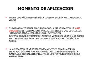 El documento proporciona recomendaciones sobre el uso de yeso como fertilizante, incluyendo dosis recomendadas para diferentes tipos de suelo y cultivos. Explica que el yeso es una fuente económica de azufre y calcio que mejora la fertilidad del suelo. Recomienda aplicarlo después de la cosecha gruesa de manera uniforme sobre la superficie. Las dosis sugeridas varían de 120 a 500 kg/ha dependiendo del tipo de suelo y cultivo.