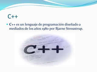C++ es un lenguaje de programación orientado a objetos diseñado en los años 1980 por Bjarne Stroustrup. Es potente para crear sistemas complejos y didáctico. Un compilador traduce el código fuente de un programa a otro lenguaje, mientras que un intérprete analiza y ejecuta programas escritos en un lenguaje de alto nivel. La programación orientada a objetos usa objetos en sus interacciones.