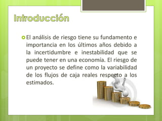 El documento discute los conceptos y métodos de análisis de riesgo para proyectos de inversión. Explica que el riesgo de un proyecto se define como la variabilidad de los flujos de caja reales respecto a los estimados. Luego, describe métodos como el de Monte Carlo y los árboles de decisión para cuantificar el riesgo. Finalmente, señala que medir el riesgo no es sencillo y que el enfoque debe ser calificar el riesgo de forma flexible en el tiempo.