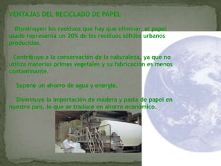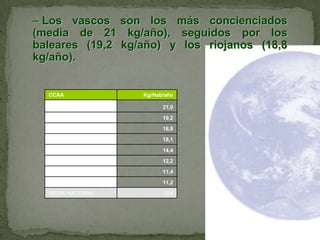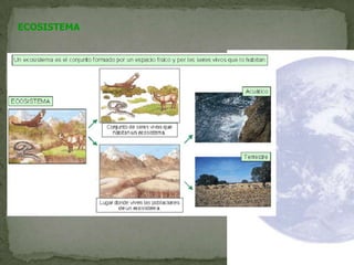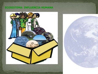 El documento describe los diferentes tipos de ecosistemas y la influencia humana en ellos, incluyendo la generación de residuos. Explica la importancia del reciclaje de papel, plástico, vidrio, metales, medicamentos, pilas, electrodomésticos y móviles para reducir los desechos, ahorrar recursos y proteger el medio ambiente.