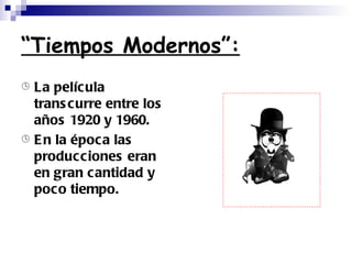 La película Tiempos Modernos de Charles Chaplin transcurre entre 1920 y 1960 y retrata las duras condiciones laborales de los trabajadores en las industrias durante ese periodo, mostrando la falta de principios éticos y el abuso del poder de los sindicatos. La película también describe la evolución de una industria particular que comienza fuerte pero luego entra en crisis y cierre, para intentar reabrir más tarde.
