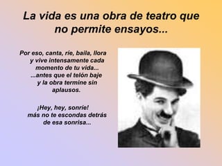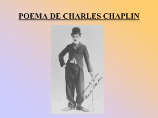 Este poema de Charles Chaplin anima al lector a vivir la vida plenamente, amando a los demás y buscando lo bueno en todo y en todos. También enfatiza la importancia de entender diferentes perspectivas, soñar sin perjudicar a otros, y descubrir la bondad interior. El poema termina expresando el amor del autor por la existencia humana.