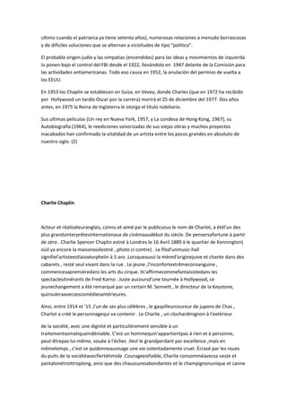(1) Charlie Chaplin fue un actor y director inglés conocido por su personaje Charlot. Creó su fortuna desde cero y se convirtió en uno de los más grandes intérpretes del cine en el siglo XX. (2) A lo largo de su carrera, Chaplin perfeccionó a Charlot y dirigió obras maestras como Tiempos Modernos y El Gran Dictador. (3) Tuvo una vida privada compleja con varios matrimonios y diez hijos, y fue investigado por el FBI debido a sus simpatías políticas de izquierda.