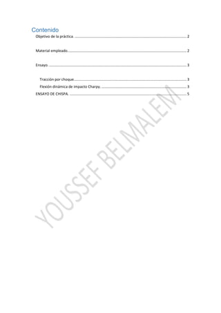 Este documento describe los procedimientos para realizar dos ensayos mecánicos comunes: el ensayo de impacto Charpy y el ensayo de chispa. El ensayo de Charpy mide la resistencia al impacto de una probeta mediante el uso de un péndulo, mientras que el ensayo de chispa permite identificar el tipo de acero de una probeta comparando la longitud de la chispa producida con tablas de referencia. El documento explica el procedimiento para cada ensayo y los tipos de resultados que se pueden obtener.