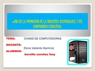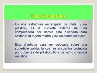 El documento describe los diferentes tipos de chasis de computadoras, incluyendo chasis de mesa, torre, mini torre, laptop, notebook y palmtop. Explica que el chasis sirve para sostener los componentes internos de la computadora como la tarjeta madre, unidades de disco y fuente de poder. También menciona algunas de las funciones del chasis como permitir el montaje de los componentes y proporcionar espacio para ellos.
