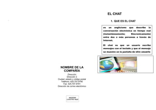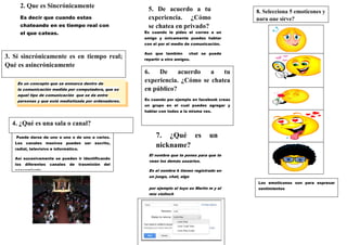 El documento habla sobre el chat y sus características. Define el chat como una conversación electrónica en tiempo real entre dos o más personas a través de Internet. Explica que el chat es sincrónico, lo que significa que la conversación ocurre en tiempo real, y contrasta esto con las comunicaciones asincrónicas. También describe las salas o canales de chat y su función, así como conceptos clave como los nicknames y el uso de emoticonos.