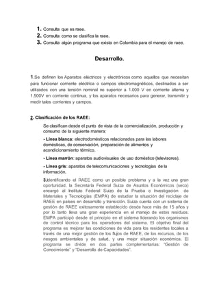 El documento habla sobre la basura electrónica o RAEE. Explica que los RAEE son aparatos eléctricos y electrónicos que necesitan corriente eléctrica o campos electromagnéticos para funcionar. Luego clasifica los RAEE en línea blanca, línea marrón y línea gris. También menciona un programa suizo llamado "Iniciativa RAEE Colombia" lanzado en 2007 para mejorar la gestión de los RAEE en Colombia a través del conocimiento y el desarrollo de capacidades. Finalmente, señala que