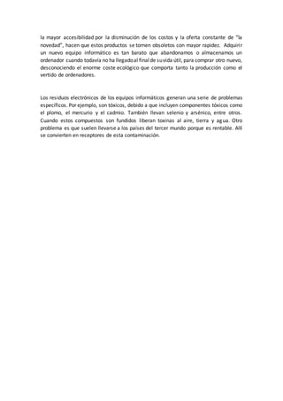 La chatarra electrónica contiene sustancias tóxicas como el mercurio, plomo y cadmio que son dañinas para la salud humana y el medio ambiente. El rápido desarrollo tecnológico y las tendencias del mercado hacen que los dispositivos electrónicos se vuelvan obsoletos más rápido y generan una gran cantidad de desechos electrónicos. El tratamiento y eliminación inadecuados de estos desechos electrónicos liberan sustancias contaminantes que contaminan el suelo, el agua y el a
