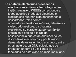 La chatarra electrónica se refiere a los productos electrónicos desechados como computadoras, teléfonos, televisores y electrodomésticos. Se produce rápidamente debido a la obsolescencia de los dispositivos y su demanda mundial creciente, generando alrededor de 50 millones de toneladas al año. El mal manejo de estos desechos contamina el medio ambiente y pone en riesgo la salud humana debido a componentes tóxicos como el plomo, mercurio y cadmio. Los países buscan
