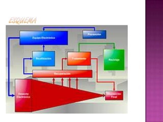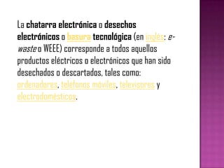Este documento discute la basura electrónica o desechos electrónicos, que incluye productos eléctricos y electrónicos desechados como computadoras, teléfonos, televisores y electrodomésticos. Se caracteriza por su rápido crecimiento debido a la obsolescencia de los dispositivos y la mayor demanda global. Los desechos electrónicos contienen elementos contaminantes como mercurio, plomo y cadmio que son dañinos para la salud y el medio ambiente. Grandes vertederos en países occidentales y China reciben