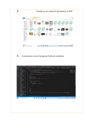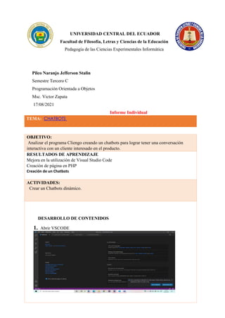 El documento describe el desarrollo de un chatbot para tener una conversación interactiva con un cliente interesado en un producto. El estudiante aprendió a utilizar Visual Studio Code para crear una página web en PHP y un chatbot dinámico con el cual puede modificar la conversación y almacenar datos del cliente.