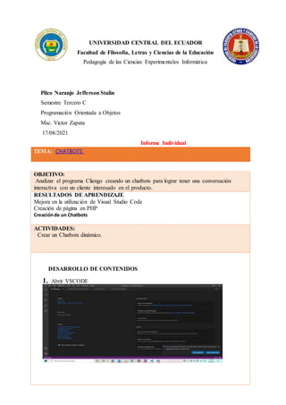 El documento describe el desarrollo de un chatbot para interactuar con clientes interesados en un producto utilizando el programa Cliengo. El estudiante aprendió a utilizar Visual Studio Code para crear una página en PHP y desarrollar un chatbot dinámico con el cual puede modificar la conversación y almacenar datos de los clientes.
