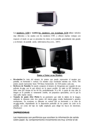 Este documento describe varios periféricos de salida para computadoras, incluyendo monitores, impresoras, parlantes, sintetizadores de voz, visualizadores y trazadores de gráficos. Explica las características y tipos de cada periférico, como la resolución y refresco de pantalla para monitores, y los métodos de impresión y calidad para diferentes tipos de impresoras como de inyección de tinta, láser y matriciales. También cubre brevemente las características de parlantes, tar