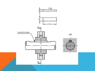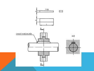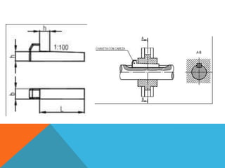 Este documento define las chavetas y lengüetas, sus diferencias y tipos. Las chavetas se insertan entre piezas para evitar deslizamientos y fijar elementos como volantes y ruedas dentadas a ejes. Las chavetas actúan como cuñas mientras que las lengüetas ajustan lateralmente. Existen varios tipos de chavetas como longitudinales, con cabeza y mediacaña.