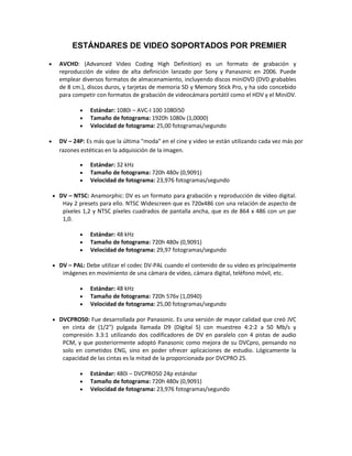 Este documento describe los diferentes estándares de video soportados por Adobe Premiere, incluyendo AVCHD, DV-NTSC, DV-PAL, DVCPRO50, DVCPROHD, HDV, Mobile & Devices, XDCAM EX y XDCAM HD. Para cada estándar se especifica la resolución, tamaño de fotograma y velocidad de fotogramas.