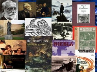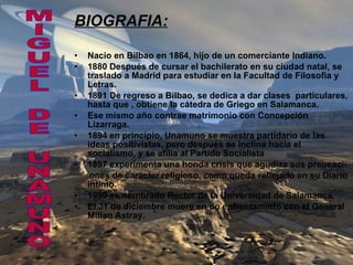 El documento presenta un resumen biográfico del escritor español Miguel de Unamuno y una lista de sus principales obras literarias. Nació en 1864 en Bilbao y estudió en la Facultad de Filosofía y Letras de Madrid. Obtuvo la cátedra de griego en la Universidad de Salamanca donde fue rector hasta su fallecimiento en 1936. Entre sus obras más destacadas se encuentran Niebla, Amor y pedagogía, Abel Sánchez y sus últimas novelas San Manuel Bueno, mártir y Don Sand