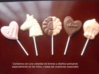 La empresa Piedadcristina Taborda Franco se dedica a la fabricación y venta de bombones de chocolate en Cartagena de Indias, ofreciendo una variedad de formas y diseños para niños y ocasiones especiales, así como diseños para enamorados, y facilita exhibidores para una excelente presentación de los productos.
