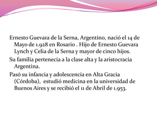 Ernesto "Che" Guevara nació en Argentina en 1928 y se convirtió en médico. Viajó por Latinoamérica y fue testigo de la opresión social, lo que lo llevó a unirse a la revolución cubana en 1955 bajo el liderazgo de Fidel Castro. Sirvió como médico y comandante del ejército revolucionario, y luego ocupó varios cargos en el nuevo gobierno cubano después del triunfo de la revolución en 1959. Más tarde, Guevara combatió en el Congo y Bolivia
