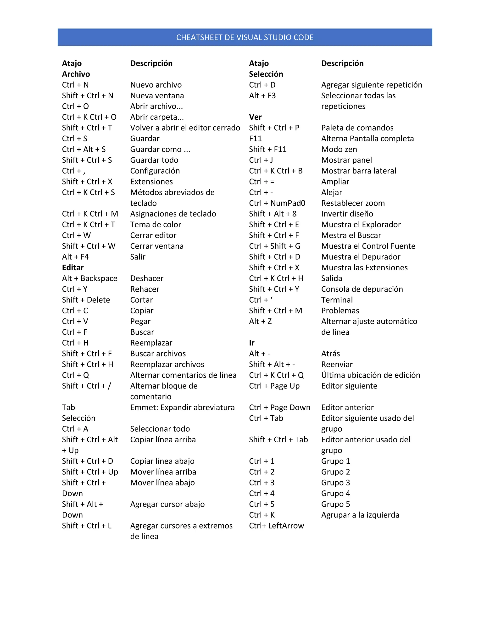 Este documento presenta un cheat sheet de atajos de teclado para Visual Studio Code. Proporciona atajos para realizar tareas comunes como abrir archivos, guardar, buscar, editar, depurar y obtener ayuda. Los atajos permiten a los desarrolladores realizar estas tareas de forma más eficiente sin necesidad de usar el mouse.
