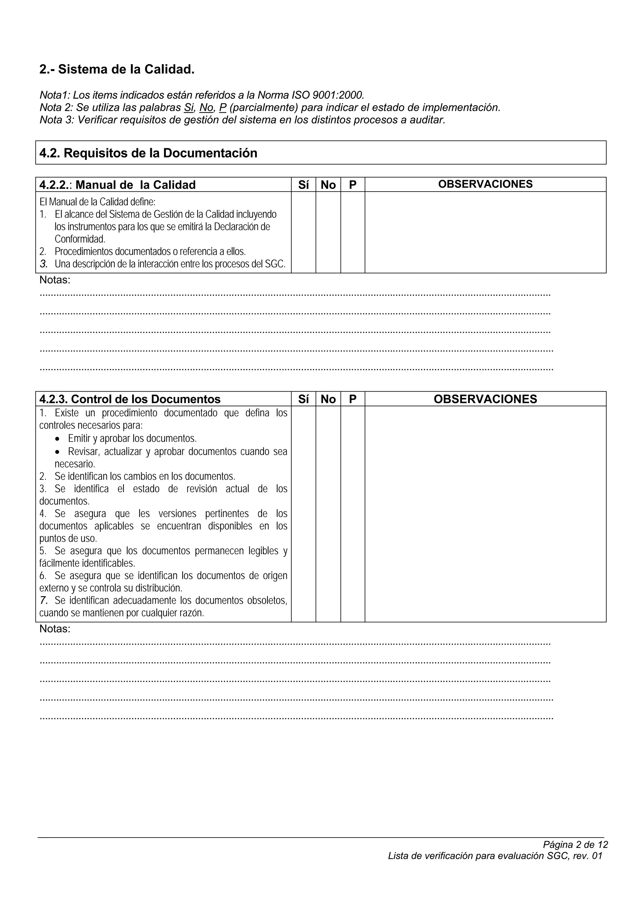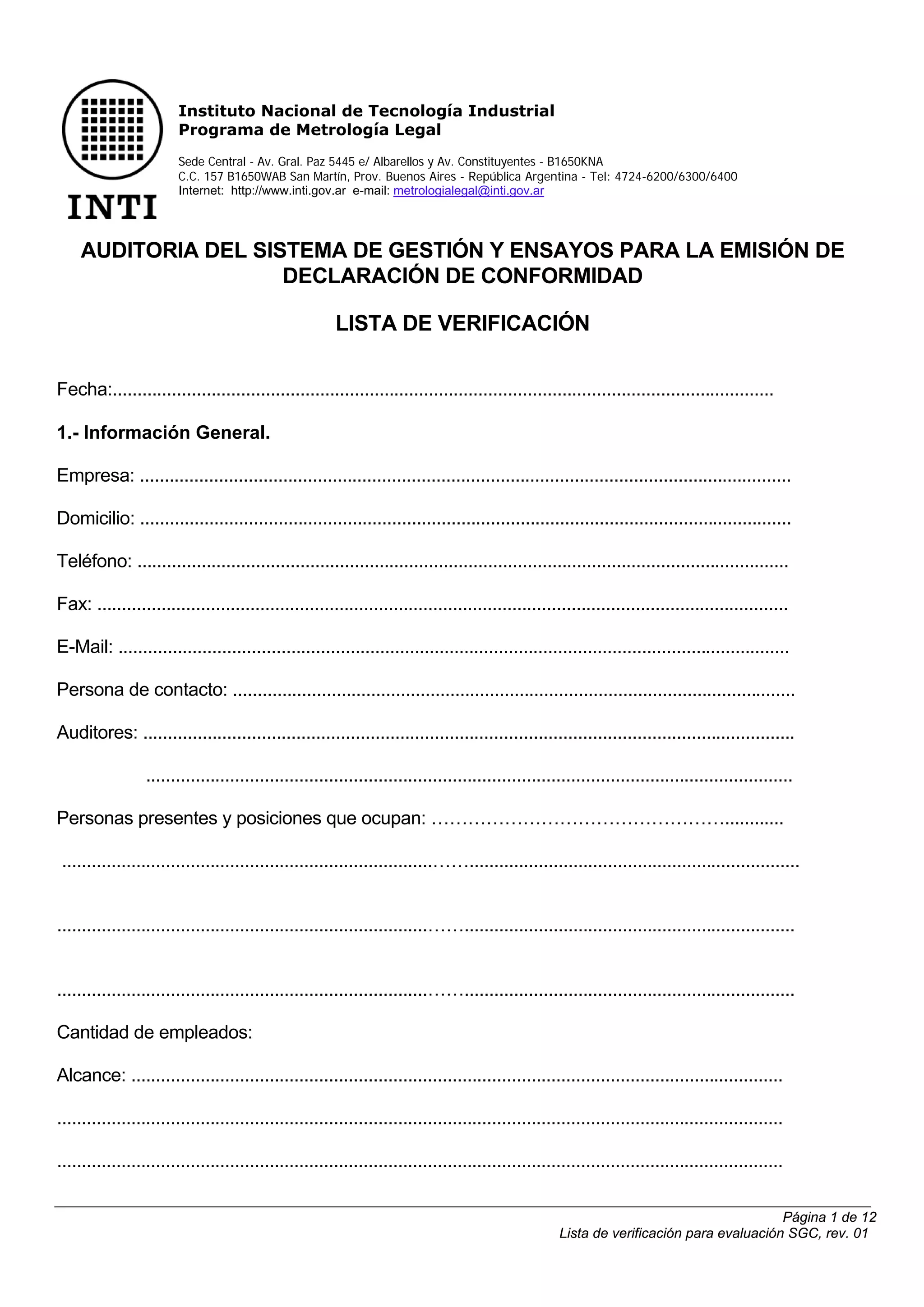 Este documento presenta una lista de verificación para auditar el sistema de gestión y los ensayos realizados por una empresa para emitir declaraciones de conformidad. La lista incluye secciones para recopilar información general de la empresa, verificar el cumplimiento del sistema de gestión de calidad con respecto a la norma ISO 9001, y confirmar que se han definido las responsabilidades y autoridades dentro del sistema.