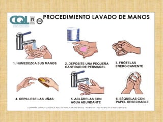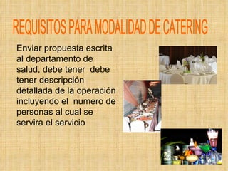 El documento describe los requisitos y procedimientos para operar un servicio de catering, incluyendo la presentación de una propuesta escrita, el uso de equipos adecuados para transportar alimentos calientes y fríos, el control de temperaturas, y la salud e higiene de los empleados para prevenir la transmisión de enfermedades. También cubre los principales síntomas de enfermedades alimentarias y la importancia de lavarse las manos correctamente.