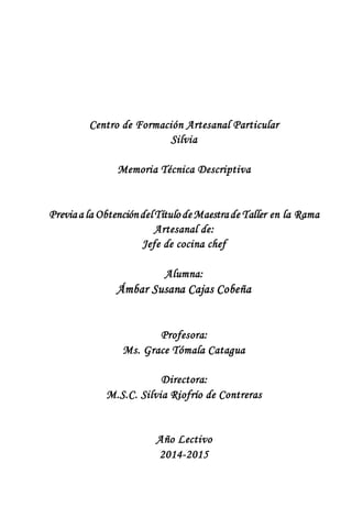 Este documento presenta un resumen técnico de Ámbar Susana Cajas Cobeña para obtener el título de Maestra de Taller en la rama artesanal de Jefe de Cocina Chef. Incluye información sobre los materiales y técnicas básicas de repostería y decoración de pasteles, como diferentes tipos de coberturas, pasos para cubrir una torta con pasas, cómo hacer flores y hojas de glass y fondant, y la técnica del glass fluido y la mermelada reducida. El resumen técnico fue realizado en