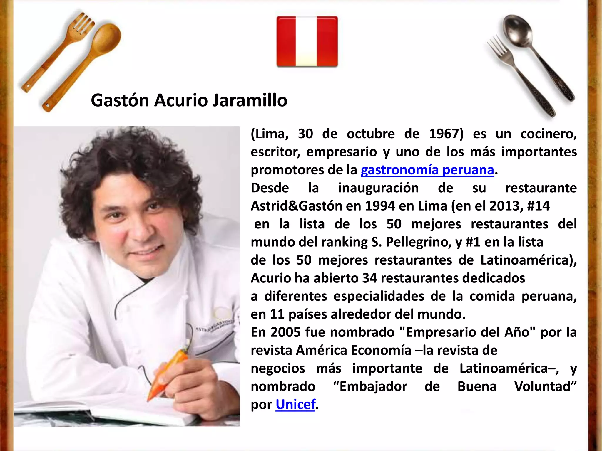 Gastón Acurio es un chef y empresario peruano que ha promovido la gastronomía peruana a nivel mundial a través de la apertura de más de 30 restaurantes dedicados a las especialidades peruanas en 11 países. Ha sido nombrado "Empresario del Año" y "Embajador de Buena Voluntad" por UNICEF por su trabajo para poner en valor los alimentos amazónicos y la cocina peruana.