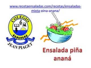 Este documento presenta una receta para ensalada de piña y ananá para diferentes cantidades de personas. Detalla los ingredientes necesarios y sus cantidades para preparar la ensalada para 4, 7 y 1 persona/s. Explica cómo calcular la cantidad correcta de ingredientes cuando se aumenta el número de personas usando la regla de tres. Agradece a la escuela, maestros y público por su atención.