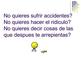 El documento promueve una campaña contra la ebriedad para evitar accidentes, comportamientos ridículos o de los que uno se arrepienta, accidentes de incontinencia o multas de tránsito. Recomienda tomar solo un vaso de cerveza y no botellas o caguamas completas para sentirse mejor y recordar lo que se hizo con los amigos sin excederse.