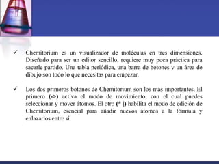 Chemitorium es un visualizador y editor sencillo de moléculas en 3D que permite a los usuarios mover y enlazar átomos para crear y ver moléculas tridimensionales. Los usuarios pueden exportar imágenes de las moléculas creadas. Aunque el editor es limitado y carece de ayuda, Chemitorium ofrece una forma fácil de ver y crear representaciones 3D de moléculas.