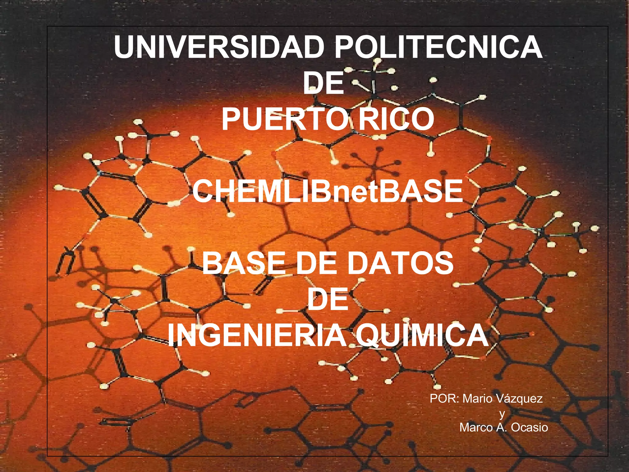 CHEMLIBnetBASE es una base de datos de libros electrónicos de ingeniería química que contiene manuales, diccionarios y enciclopedias. La base de datos organiza los libros en 20 categorías diferentes relacionadas con temas de química analítica, catálisis, química computacional, electroquímica, combustibles, química general, geoquímica, química industrial, química inorgánica, cristales líquidos, química de materiales, química orgánica, fotoquí