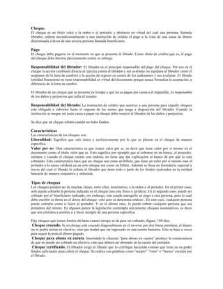 3) Existen diferentes tipos de cheques como nominativos, a la orden, al portador, cruzados y para abono en cuenta.