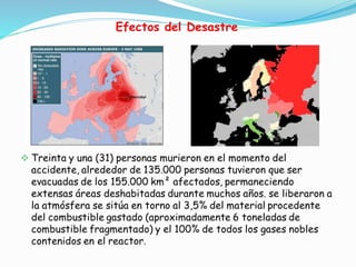 El documento describe el accidente nuclear de Chernóbil que ocurrió el 26 de abril de 1986 en una central nuclear en Ucrania. Durante una prueba simulando un corte de energía, hubo un aumento súbito de potencia en el reactor 4 que causó su sobrecalentamiento y explosión, liberando materiales radiactivos. Cientos de miles de personas tuvieron que participar en la limpieza y varios países de Europa resultaron contaminados por el cesio radiactivo liberado.
